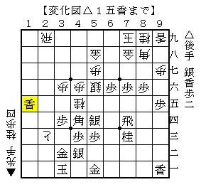 先手は1筋から攻め込みますが後手は受け流すといった感じで、後手は△8六歩から1筋で入手した香車を△8七香と打ち込む展開です。
