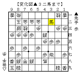 ▲3二馬に△3七馬なら▲同桂△3九飛▲4五桂△1九飛成▲5三桂成△同金直▲同銀成△同金▲5五角で、ソフトの評価値+106で互角。