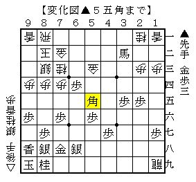 この手順は△9五歩の端攻めには自然に対応して最後の▲6五馬が好位置です。