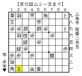 △2一玉に▲1一飛成△同玉▲3三角なら△2二香で、ソフトの評価値-1848で後手優勢。