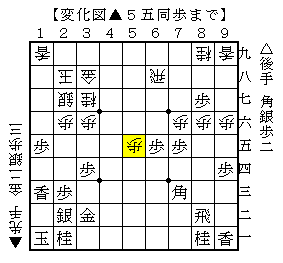 この手順は△6五歩▲5五角とする手で、以下角と金の交換になります。