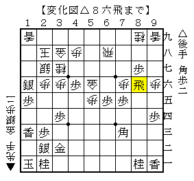 以下△4六歩▲4八歩△8六飛で、次に△7六飛や△8八歩成が受けづらく後手有利のようです。