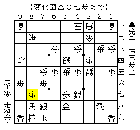 △7四桂以下▲3六歩△2四銀▲4六桂△8六桂▲8七歩△7八桂成▲同銀で、ソフトの評価値-760で後手有利。