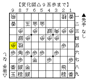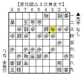 △3三角以下▲6八銀△8五桂▲8六角△9一飛▲7九銀右△9五歩で、ソフトの評価値-266で互角。