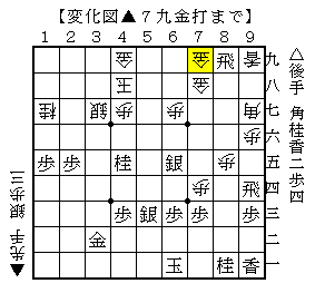 上図は、先後逆で相居飛車からの進展で▲7九金打とした変化手順の局面。ソフトの評価値-3063で後手勝勢。