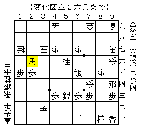 △2六角では△2六銀もありそうですが、以下▲4六玉△3五角▲3六玉△5七角成に先手の手番になります。