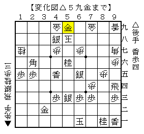 △2六角以下▲4六玉△4五香▲5七玉△4八銀▲5八玉△5九金で、ソフトの評価値-99996で後手勝勢。
