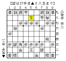 上図は、先後逆で後手横歩取り△8四飛型からの進展で▲5八玉と上がった局面。ソフトの評価値-17で互角。