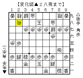 ▲2八飛以下△3四銀▲3八銀△3五銀▲6八玉△2四飛▲2七歩△7四歩▲8二角△7三角▲同角成△同銀▲8六銀で、ソフトの評価値-173で互角。