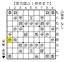 △1四歩に▲同歩なら△同香▲1五歩△1八歩▲同香△7六馬▲同銀△1九飛で、ソフトの評価値-1105で後手優勢。