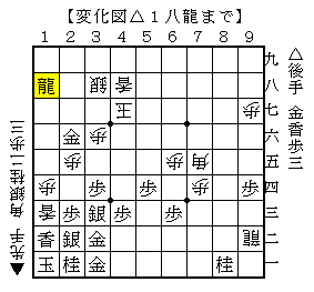△1八龍として香車を入手するのと1筋の受けにと3八の地点にも利いており、まずまずの位置だったようです。