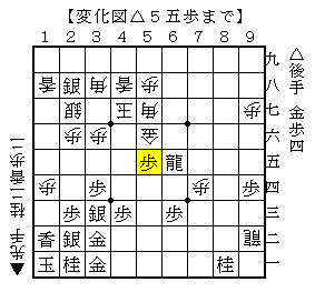 △2八銀▲4七玉△5九龍▲5八歩△6八龍▲5七角△6五龍▲5六金△5五歩で、ソフトの評価値-99978で後手勝勢。