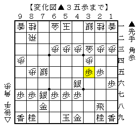 この手順は銀交換から△3五歩に▲5五角と中央に角を打つ手で、以下△6四角で角の交換になります。