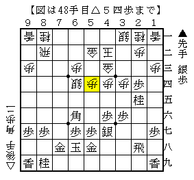 実戦は△2二歩以下▲2五桂△4三金寄▲5五角△6四銀▲6六角△5四歩で、ソフトの評価値-118で互角。