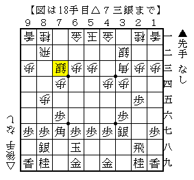 上図は、後手雁木模様に先手▲3七銀型からの進展で△7三銀と上がった局面。