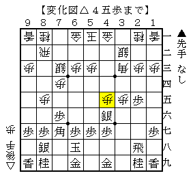 本局の変化手順の△4五歩ですが以下▲同銀△7七角成▲同桂で、ソフトの評価値+6で互角。
