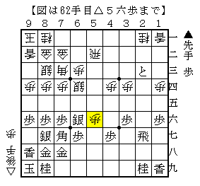 将棋は先手が数手前に▲2四歩~▲2三歩成とと金をできる展開で、この局面は先手が少し指しやすいと思っていましたが、後手も△5六歩と歩を取り込んで読み筋のようでした。