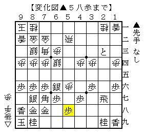 ▲5八歩以下△5七歩成▲同銀△7五歩▲4四角△2六歩▲同飛△4二飛▲1一角成△4七飛成▲6八銀で、ソフトの評価値+558で先手有利。