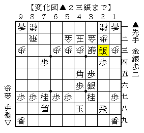 2筋を抑えた形に▲2三銀と金駒を打ってがりがり攻める手で、少し筋は重たいのですが先手は飛車と角がよく利いているようです。