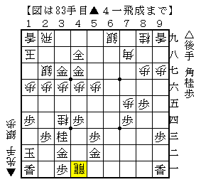 上図は、先後逆で先手が角交換振り飛車からの進展で▲4一飛成とした局面。ソフトの評価値-5555で後手勝勢。