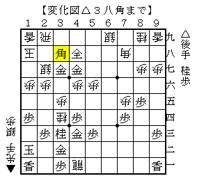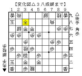 △4三金右▲3五歩△3八角で、ソフトの評価値-50000で後手勝勢。
