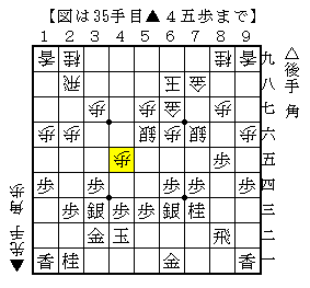 この手順は、△4五歩と歩を取り返した形は後手が少し得をしているようです。