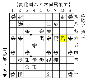 △8六同飛に▲7九玉なら△8一飛▲8七歩△6二金で、ソフトの評価値-178で互角。