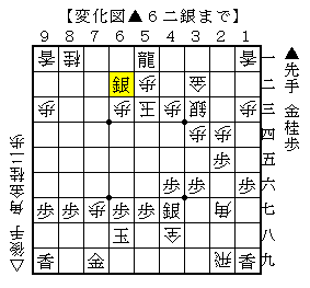 先手の持ち駒が金桂歩で少ないので、ここで銀を使って大丈夫なのかと少し気になります。
