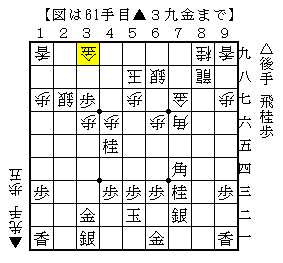 上図は、先後逆で後手横歩取りに先手青野流からの進展で▲3九金とした局面。ソフトの評価値-2140で後手勝勢。