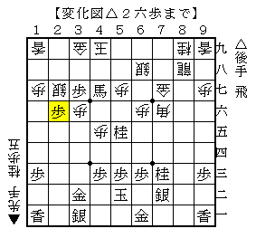 △2六歩はソフトの候補手の1つでこれでも後手優勢のようですが、ソフトの推奨手ではありませんでした。