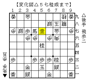 最初の局面図から急所の△5五桂が指せればこのような展開もあり、後手の角の働きが抜群になりそうです、