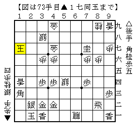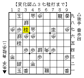 △2三金▲1三香成△2五桂▲2八玉△1七角▲2九玉△1三金▲1八歩で、ソフトの評価値+345で先手有利。