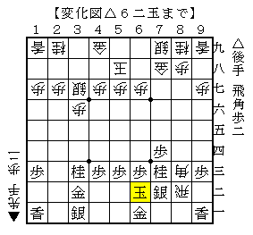 △6四角以下▲3四歩△7四歩▲4六角△同角▲同歩△7五歩▲2三歩△同銀▲5五角△7六歩▲6五桂△7七歩成▲同角△7六飛で、ソフトの評価値-218で互角。