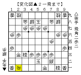 △2六歩に▲2四歩として、以下△1二銀に▲2三角と打ちこんで清算してから▲2一飛とする形です。