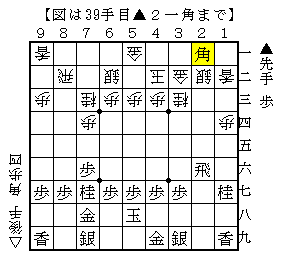 実戦は▲2三同飛成△同金▲1二角成△2二歩で、ソフトの評価値+219で互角。