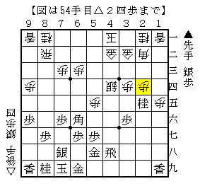 上図は、居飛車対振り飛車の対抗形からの進展で△2九馬と桂馬を取った局面。ソフトの評価値-247で互角。