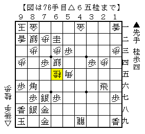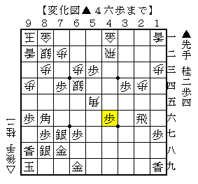 この手順は、角と銀桂の2枚替えで先手が駒損も3六の歩と3七の金の位置がよく、後手が歩切れであまり手がないので、▲2二角からゆっくりした展開で先手が指せそうです。