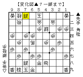 △8三銀以下▲7一角△7二飛▲8二金△7一飛▲同金△2九飛▲7九飛△2六角で、ソフトの評価値-1187で後手優勢。