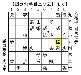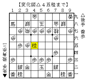 本譜は▲2九飛△3三桂▲3四銀△5六飛▲3三桂成△6四桂で、ソフトの評価値-51で互角。