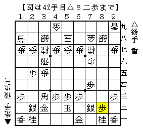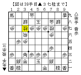 駒割りは銀と桂馬の交換で先手が少し駒得ですが、後手は3七の馬が良く働いています。