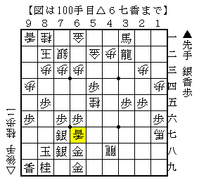 本譜は以下、△5五歩▲2一飛成△2九飛成▲9四歩△同歩▲8五桂△1九龍で、ソフトの評価値-604で後手有利。