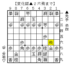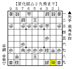 もう1つは、△2九飛▲3八銀△3九飛成▲4九角△4八銀▲2六飛で、ソフトの評価値-301で後手有利。