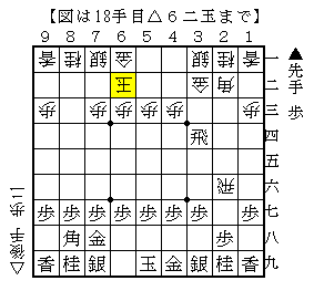 ▲6八銀引以下、△6五歩▲同歩△同銀▲6六歩△7四銀▲9六歩△5二金左▲8八銀で、ソフトの評価値+237で互角。