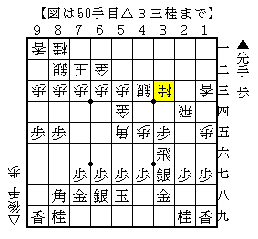 本譜は以下、▲2四歩△同角▲5五歩△6三銀▲3六歩△5二金左▲8八銀で、ソフトの評価値+29で互角。