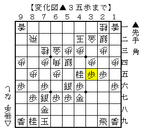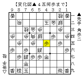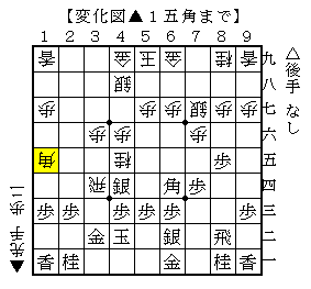 以下、▲5五角から、駒損を重ねる展開でだめになりました。▲5五角は、△4六歩▲同歩△5四桂を事前に受けた手です。
