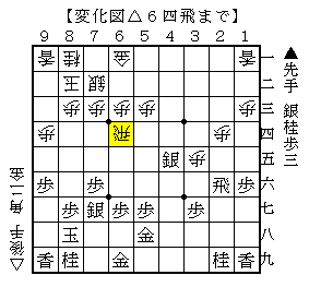 この手順の▲6一香成は△同玉なら▲8三桂と打つつもりだったのですが、△6一同金とされてぱっとしません。